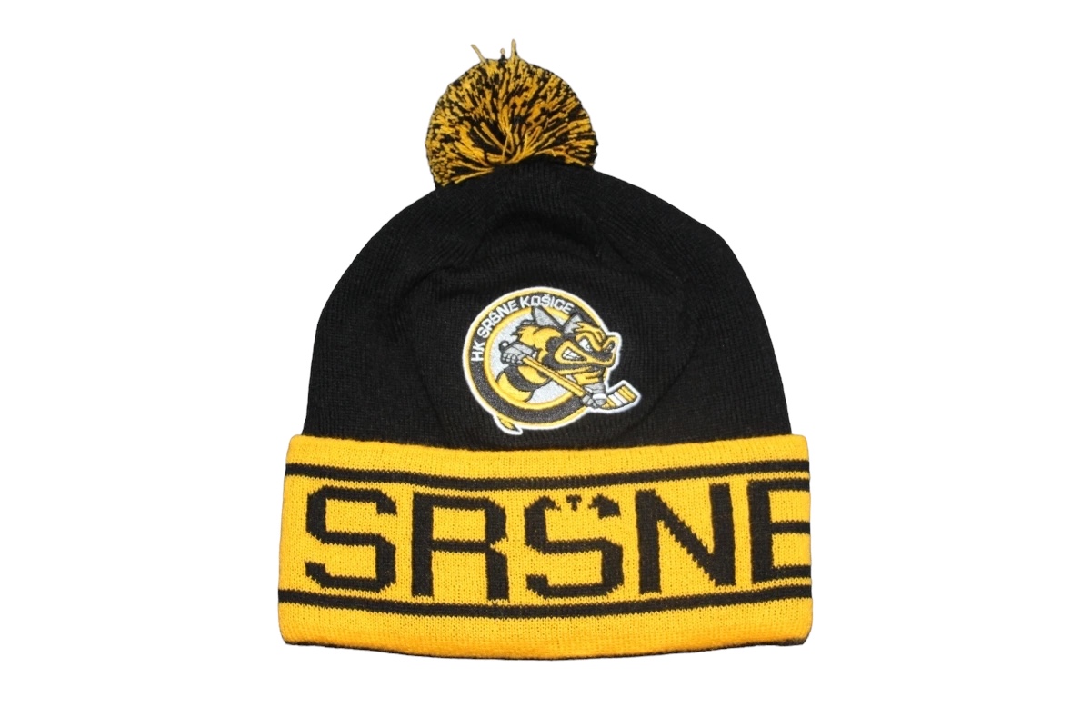 Zimná čiapka so žltou bombuľou a žltým lemom s nápisom sršne
